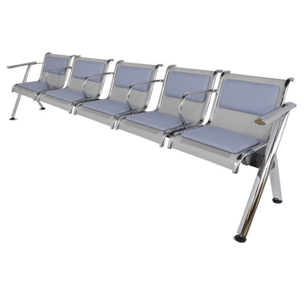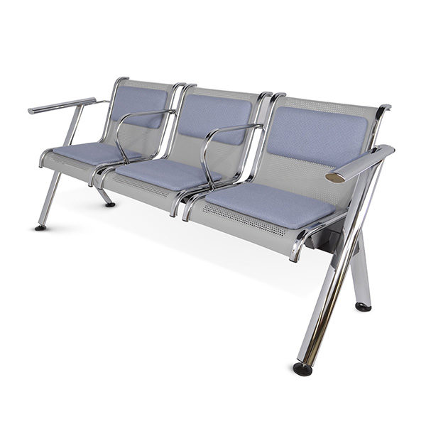 Brazos y patas fabricados con tubular ovalado de 2 1/2″ x 1 1/4″ con acabado en cromo, plazas en lámina multiperforada color gris con soportes en cada extremo de cada plaza cromados con brazos intermedios. Asiento y respaldo tapizados en tela color a elección de nuestro catálogo. Regatones niveladores en cada extremo de cada pata.